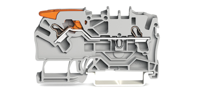 BORNA DE PASO PARA 2 CONDUCTORES; C/PALANCA Y PUSH-IN CAGE CLAMP; 2,5 MM?; CON ORIFICIO DE PRUEBA; MARCAJE LATERAL Y CENTRAL; PARA CARRIL DIN 35 X 15 Y 35 X 7,5; 2,50 MM?; COLOR: GRIS;
