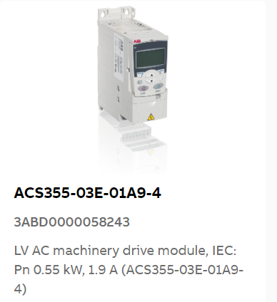 DRIVE NUMERO DE PARTE: ACS355-03E-01A9-4 POTENCIA EN PAR VARIABLE: 0.55 KW (1.9 A); TENSION DE ENTRADA: 380 A 480 V; CONTROL VECTORIAL Y ESCALAR; GRADO DE PROTECCION: IP21; DIMENSIONES: 161 MM X 239 MM X 70 MM; BASTIDOR: R1; PESO: 1.7 KG.
