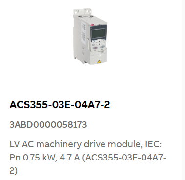 DRIVE NUMERO DE PARTE: ACS355-03E-04A7-2 POTENCIA EN PAR VARIABLE: 0.75 KW (4.7 A); TENSION DE ENTRADA: 200 A 240 V; CONTROL VECTORIAL Y ESCALAR; GRADO DE PROTECCION: IP21; DIMENSIONES: 161 MM X 239 MM X 70 MM; BASTIDOR: R1; PESO: 1.8 KG.