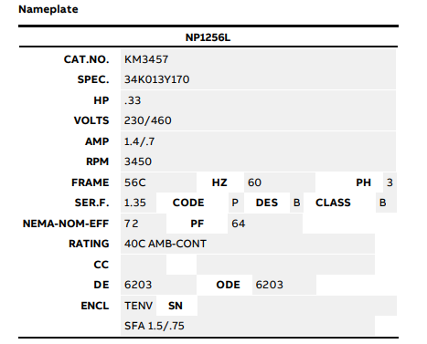 MOTOR TRIFASICO .33HP, 230/460V, 3450 RPM, FRAME 56C, 60 HZ, SERV .F 1.35 MARCA BALDOR NO. DE PARTE KM3457